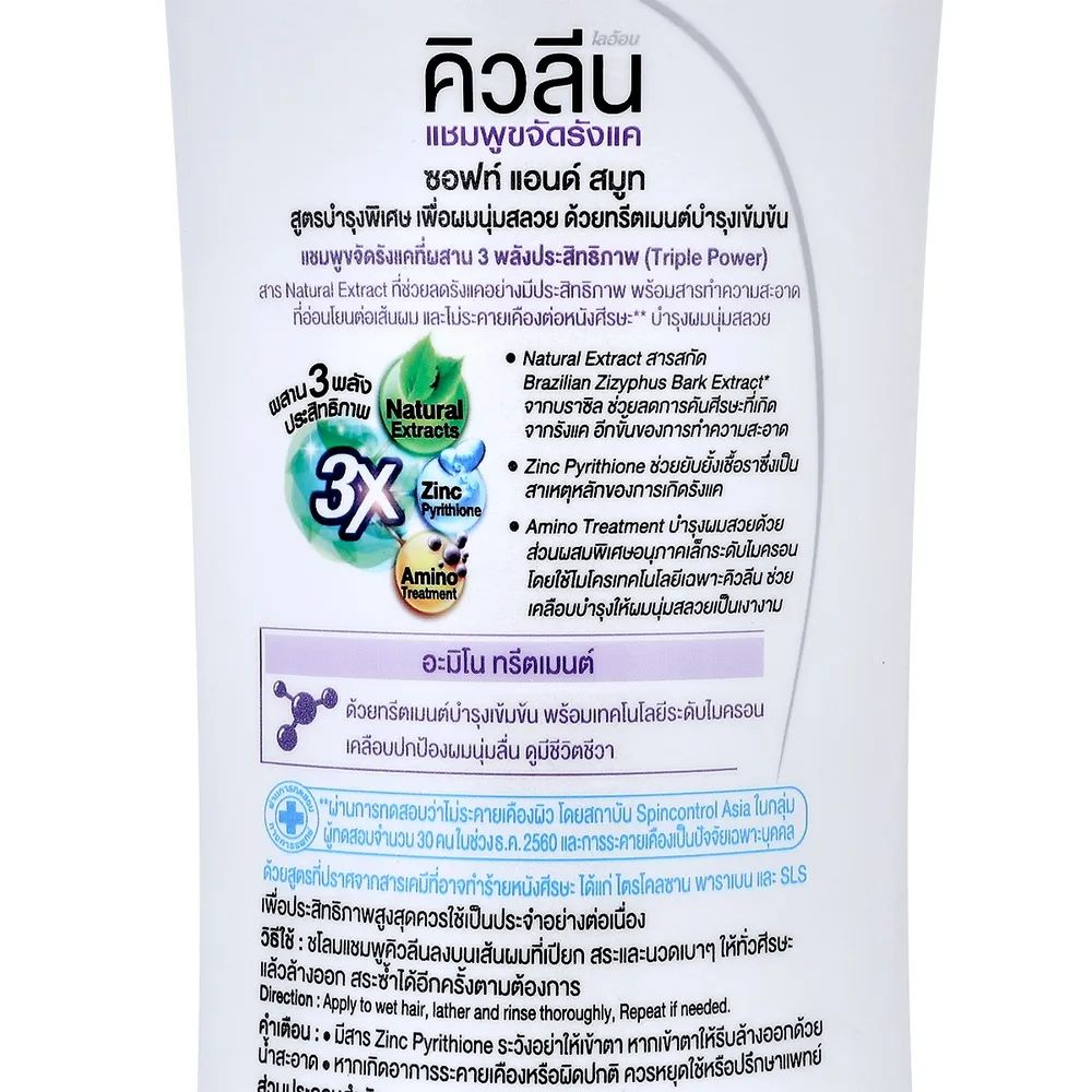 คิวลีน แชมพูขจัดรังแค สูตรบำรุงพิเศษ ที่มีส่วนผสมคุณภาพดีอย่างอมิโน ทรีตเมนต์ ที่จะเข้าบำรุงเส้นผมได้อย่างล้ำลึกเข้มข้น ด้วยเทคโนโลยีระดับไมครอนเคลือบปกป้องเส้นผมให้นุ่มลื่นดูมีชีวิตชีวา พริ้วสลวย ปราศจากรังแค เหมือนทำทรีตเมนต์จากซาลอนชื่อดัง<br />