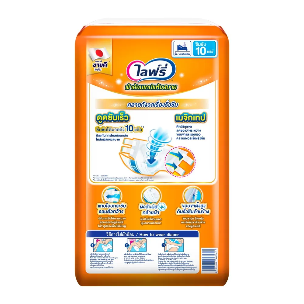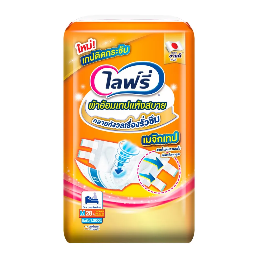 ไลฟ์รี่ ผ้าอ้อมผู้ใหญ่ แบบเทป ขนาด M 28 ชิ้น ซึมซับดี แห้งสบาย นุ่ม ยืดหยุ่น ผิวสัมผัสมีคุณสมบัติคล้ายผ้าฝ้ายทำให้นุ่มและระบายอากาศได้ดี ติดซ้ำได้หลายครั้ง ปรับกระชับกับร่างกาย ไม่เลื่อนหลุด<br />