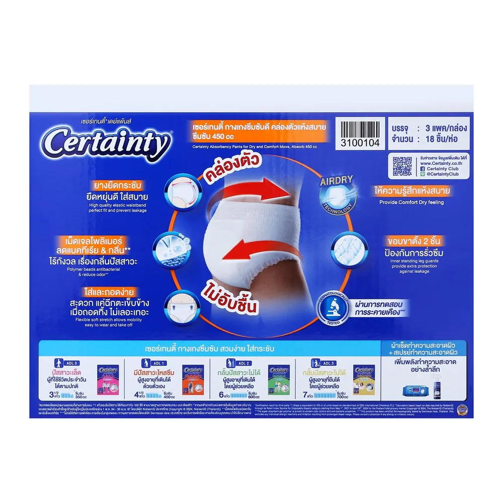 เซอร์เทนตี้ กางเกงผ้าอ้อมผู้ใหญ่ เดย์แพ้นส์ กางเกงอนามัยสำหรับผู้ใหญ่ ทำให้มั่นใจ ไร้กังวล ลดได้ทั้งแบคทีเรีย กลิ่นปัสสาวะ สามารถรองรับการซึมซับแบบปกติ เหมาะสำหรับผู้ที่ยังพอควบคุมการปัสสาวะได้ รู้สึกแห้งสบายขณะสวมใส่ พร้อมผิวสัมผัสนุ่ม สบายผิว<br />