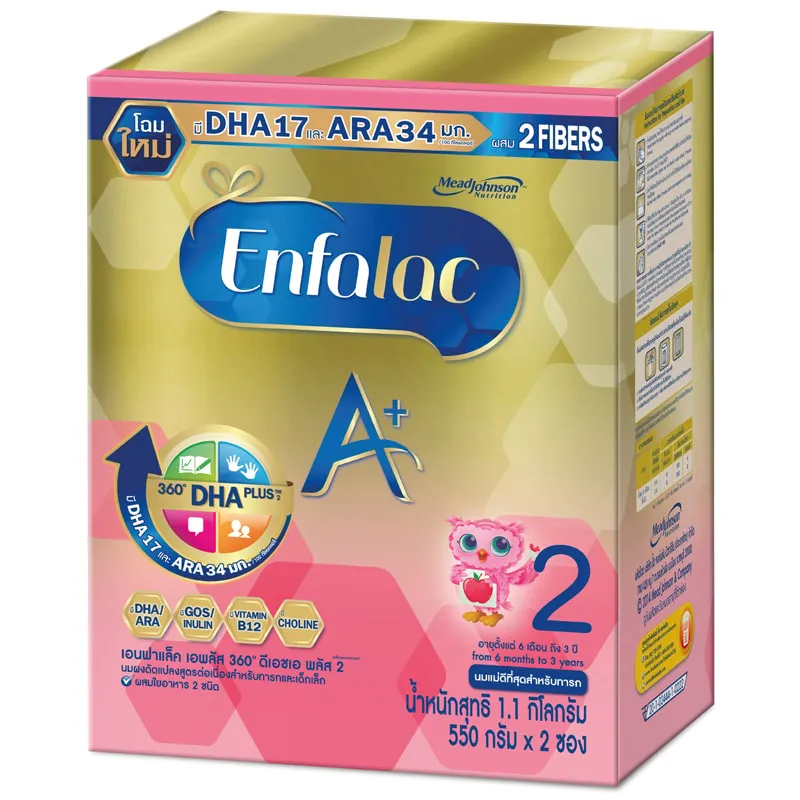 <p><strong>เอนฟาแล็ค เอพลัส 360 ดีเอชเอ พลัส นมผงดัดแปลงสำหรับเด็ก สูตร 2 ขนาด 1,100 ก.</strong><br /><strong>นมผงดัดแปลงสูตรต่อเนื่องสำหรับทารกและเด็กเล็ก อายุตั้งแต่ 6 เดือน ถึง 3 ปี</strong><br /><strong>คุณสมบัติ</strong><br />- ประกอบด้วยสารอาหารที่มีประโยชน์ต่อทารกและเด็กเล็กนานาชนิด ได้แก่<br />- ดีเอชเอ 17 มก. และ เออาร์เอ 34 มก. ต่อ 100 กิโลแคลอรี มีกรดไขมันไม่อิ่มตัว ชนิดสายโซ่ยาว<br />- ใยอาหาร 2 ชนิด กาแลตโตโอลิโกแซคคาไรด์และอินนูลิน เพื่อช่วยปรับลักษณะอุจจาระให้ดีขึ้นและช่วยการทำงานของแบคทีเรียชนิดดีในลำไส้<br />- วิตามินบี 12 <br />- โคลีน 24 มก.ต่อ 100 กิโลแคลอรี่ <br />- ไอโอดีน 20 มคก ต่อ 100 กิโลแคลอรี เป็นส่วนประกอบที่สำคัญของฮอร์โมนไทรอยด์ ซึ่งทำหน้าที่ควบคุมการเจริญเติบโต และการพัฒนาของร่างกายและสมอง<br />- นิวคลิโอไทด์ เป็นสารอาหารที่พบในน้ำนมแม่<br />- ทอรีน <br />- โอเมก้า 3,6,9 เป็นกรดไขมันจำเป็น<br />- วิตามินเอ ช่วยในการมองเห็น<br />- วิตามิน ซี และอี <br />- แคลเซียม และฟอสฟอรัสสูง มีส่วนช่วยในกระบวนการสร้างกระดูกและฟันที่แข็งแรง<br />- ธาตุเหล็ก เป็นส่วนประกอบสำคัญของฮีโมโกลบินในเม็ดเลือดแดง<br />- สังกะสี 3.8 มก. ต่อ 100 ก.</p>