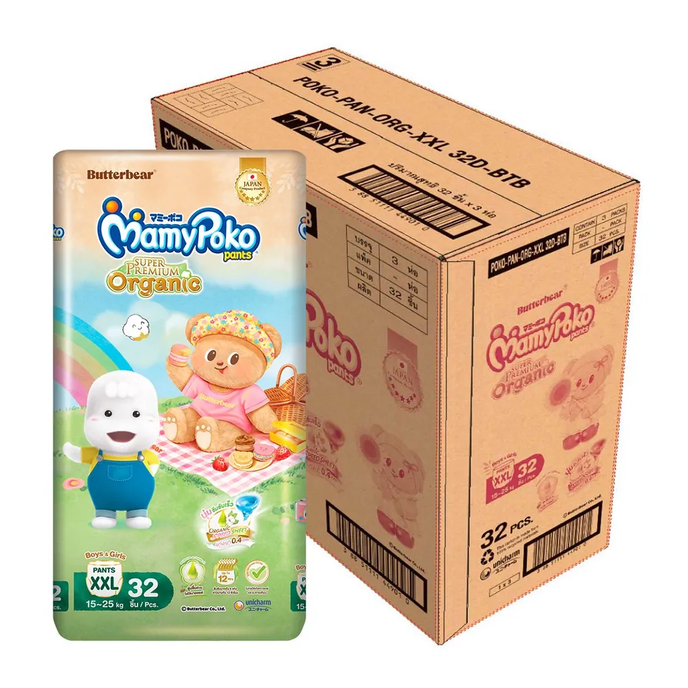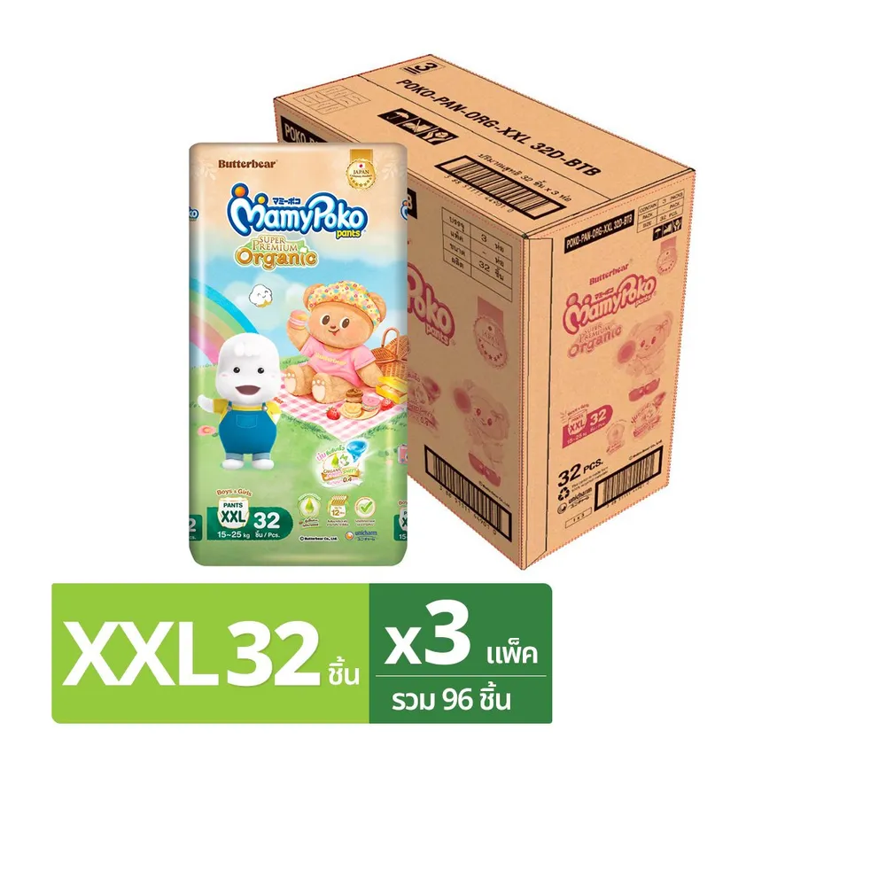 มามี่โพโค แพ้นท์ ซุปเปอร์ พรีเมียม ออร์แกนิค กางเกงผ้าอ้อม ขนาด XXL 32 ชิ้น x 3 แพ็ค
