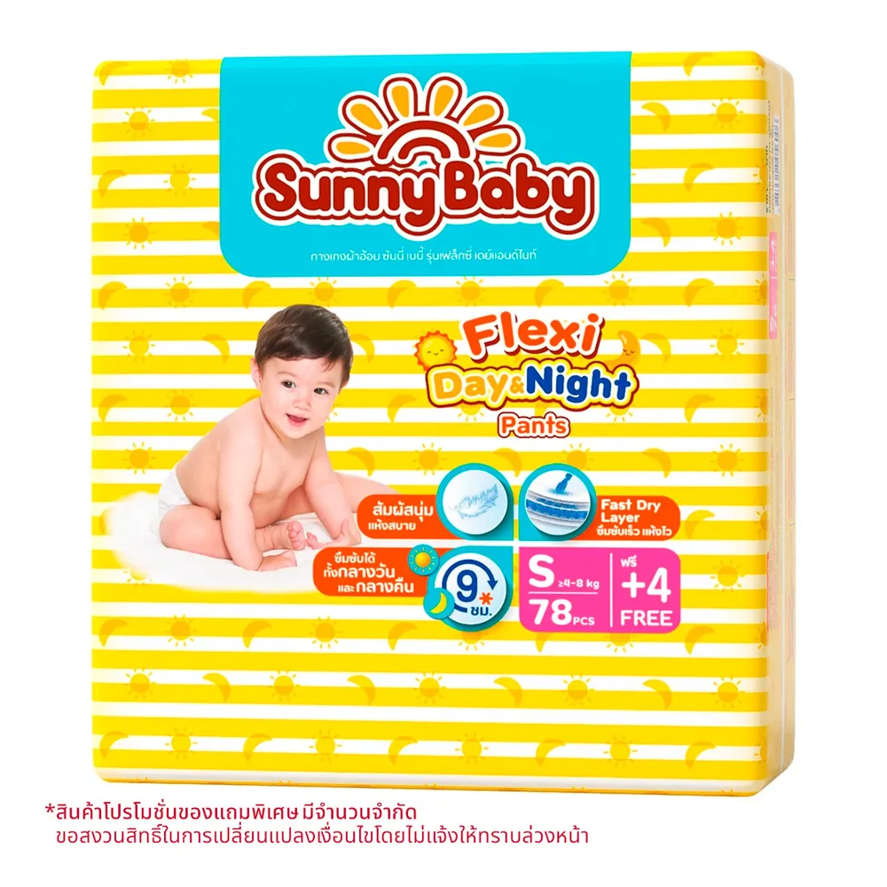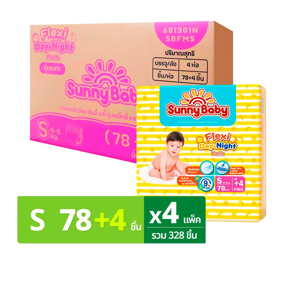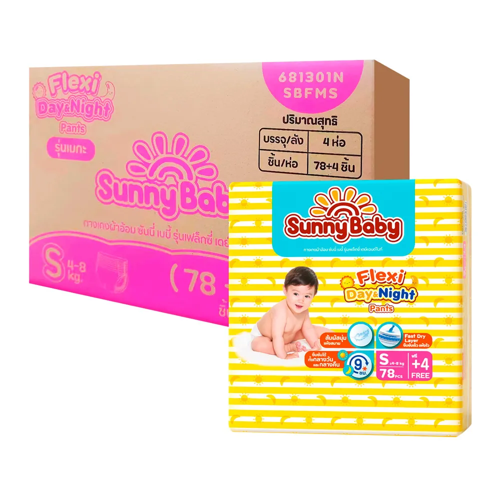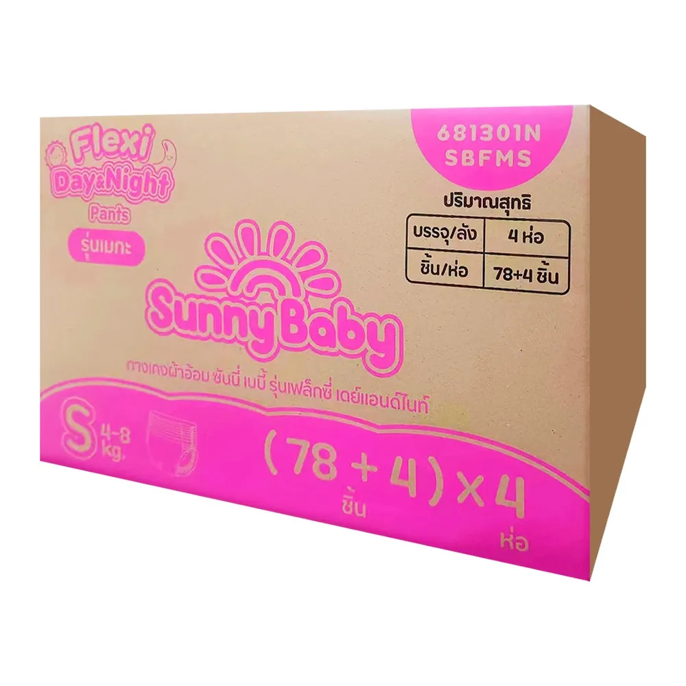 ซันนี่ เบบี้ เฟล็กซี่ เดย์แอนด์ไนท์ แพ้นท์ กางเกงผ้าอ้อม ขนาด S 78+4 ชิ้น x 4 ห่อ