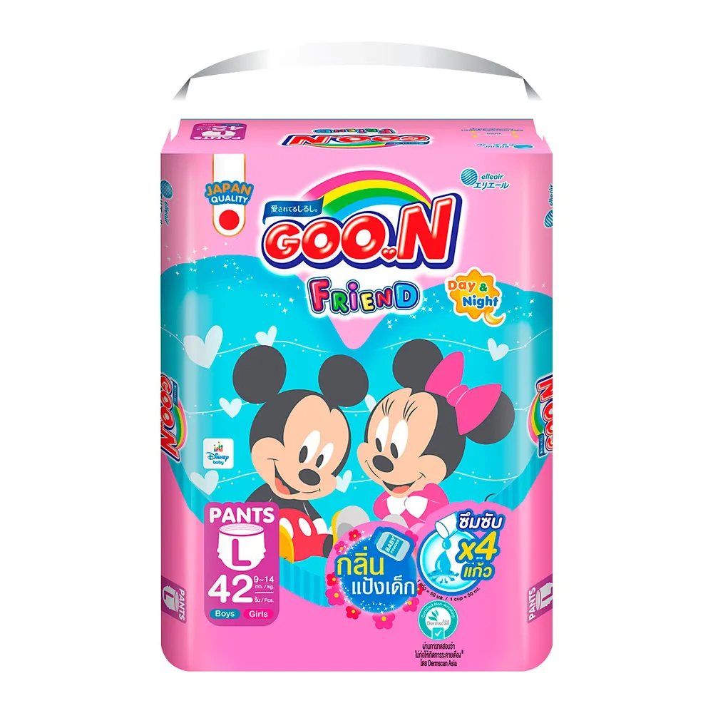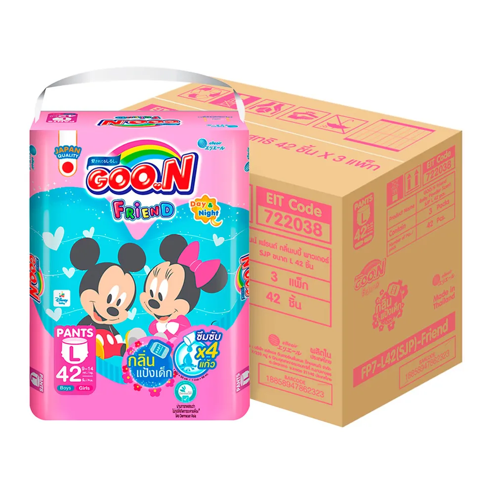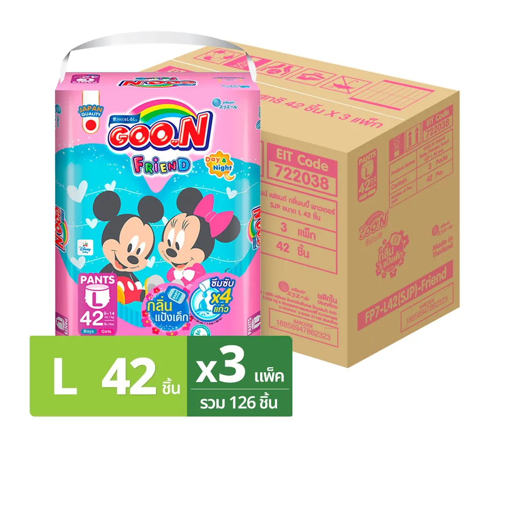 กูนน์ เฟรนด์ ผ้าอ้อมเด็กแบบกางเกง กลิ่นแป้งเด็ก ขนาด L 42 ชิ้น แพ็ค 3