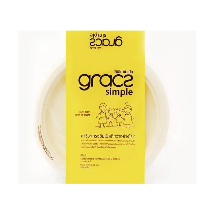 เกรซ จานภาชีวะ ขนาด 9 นิ้ว ภาชนะเพื่อชีวิตที่ยืนยาว ผลิตจากเยื่อพืชธรรมชาติ โดยเป็นบรรจุภัณฑ์จากเยื่อชานอ้อยผสมเยื่อไผ่ มีสีครีมจากสีธรรมชาติของเยื่อไผ่ สามารถนำมาอุ่นอาหารในไมโครเวฟได้ ปลอดภัยไร้สารก่อมะเร็ง ใส่อาหารได้ทั้งร้อนและเย็นโดยไม่รั่วซึม ที่สำคัญยังย่อยสลายได้ภายใน 6 สัปดาห์<br />