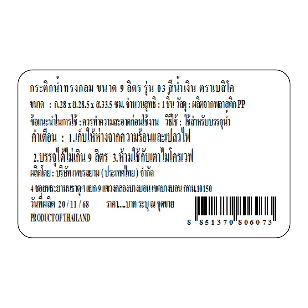 <p>เบสิโค กระติกน้ำทรงกลม รุ่น 03<br /> <br /> วัสดุ Food Grade ปลอดสารอันตราย ไม่มีกลิ่น ไม่เป็นอันตรายต่อการสัมผัสอาหารและน้ำดื่ม โครงสร้างผนังสองชั้น พร้อมฝาปิดแน่น ช่วยรักษาอุณหภูมิความเย็นได้ยาวนานหลายชั่วโมง ดีไซน์ทรงกลมจับถนัดมือ น้ำหนักเบา เหมาะใช้ภายในบ้าน ร้านค้า ร้านอาหาร หรือระหว่างจัดกิจกรรมกลางแจ้ง พร้อมเติมเต็มความสดชื่นให้คุณทุกช่วงเวลา<br /> <br /> - ได้มาตรฐานอุตสาหกรรม มอก. ภาชนะเครื่องใช้พลาสติกสำหรับอาหารเล่ม 1<br /> - วัสดุ พลาสติก PP<br /> - เก็บให้ห่างจากความร้อนและเปลวไฟ บรรจุได้ไม่เกิน 9 ล. ห้ามใช้กับเตาไมโครเวฟ<br /> - ขนาด (กว้าง x ยาว x สูง): 28 x 29.5 x 33.5 ซม.<br /> <br /> <span style="color: #ff0000;">*บริษัทฯ ขอสงวนสิทธิ์ในการปรับเปลี่ยนราคาจำหน่ายและโปรโมชั่น รวมถึงแพ็คเกจและปริมาณสินค้าจากผู้ผลิตได้ตามความเหมาะสม โดยไม่จำเป็นต้องแจ้งให้ทราบล่วงหน้า</span><br /> <br /> *สีของสินค้าอาจมีความแตกต่าง ขึ้นอยู่กับการตั้งค่าของแต่ละหน้าจอ และภาพประกอบใช้เพื่อการโฆษณาเท่านั้น</p>