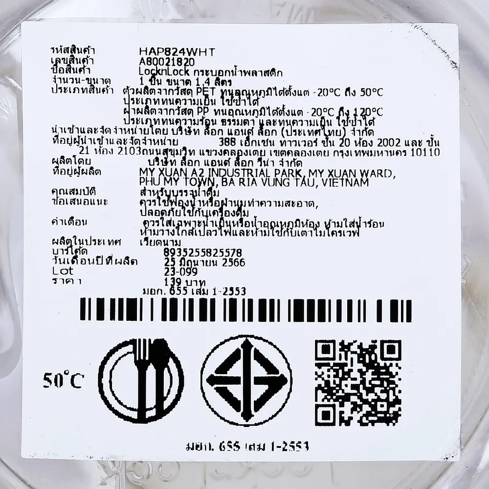<p>ล็อกแอนด์ล็อก กระบอกน้ำพลาสติกฝาสไลด์ รุ่น HAP824WHT<br /><br />ตอบโจทย์ไลฟ์สไตล์คนรุ่นใหม่ ดีไซน์นำสมัย ฝาสไลด์ใช้งานง่าย ทุกชิ้นส่วนผลิตจากวัสดุคุณภาพสูง<br /><br />- ตัวกระบอกน้ำผลิตจากวัสดุ PET คุณภาพสูง ป้องกันการแตกร้าว และสารที่ก่อให้เกิดมะเร็ง (BPA Free)<br />- ตัวฝาผลิตจากวัสดุ PP<br />- ไม่มีสี ไม่มีกลิ่น ปลอดภัยต่อสุขภาพผู้ใช้<br />- ตัวกระบอกน้ำสามารถทนอุณหภูมิได้ตั้งแต่ -20&deg;C ถึง 50&deg;C<br />- ตัวฝาสามารถทนอุณหภูมิได้ตั้งแต่ -20&deg;C ถึง 120&deg;C<br />- ฝาขวดสไลด์แบบ 2 ขา ช่วยให้เปิด-ปิดง่ายกว่าเดิม<br />- ปากแก้วกว้าง ฝาถอดแยกได้ เติมน้ำได้สะดวก<br />- ความจุ 1.4 ล.<br /><br />*สีของสินค้าอาจมีความแตกต่าง ขึ้นอยู่กับการตั้งค่าของแต่ละหน้าจอ และภาพประกอบใช้เพื่อการโฆษณาเท่านั้น</p>