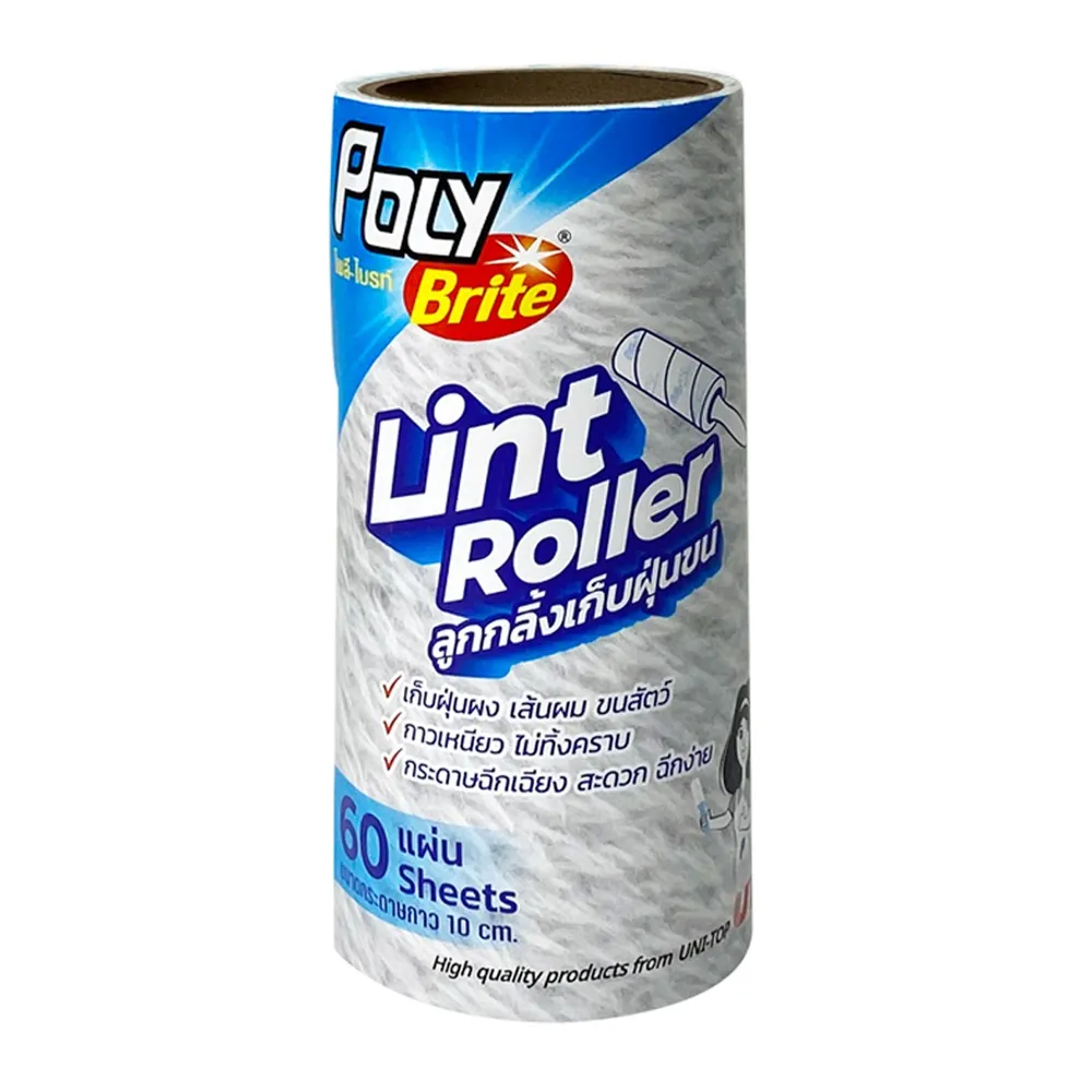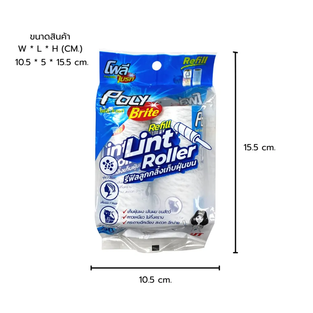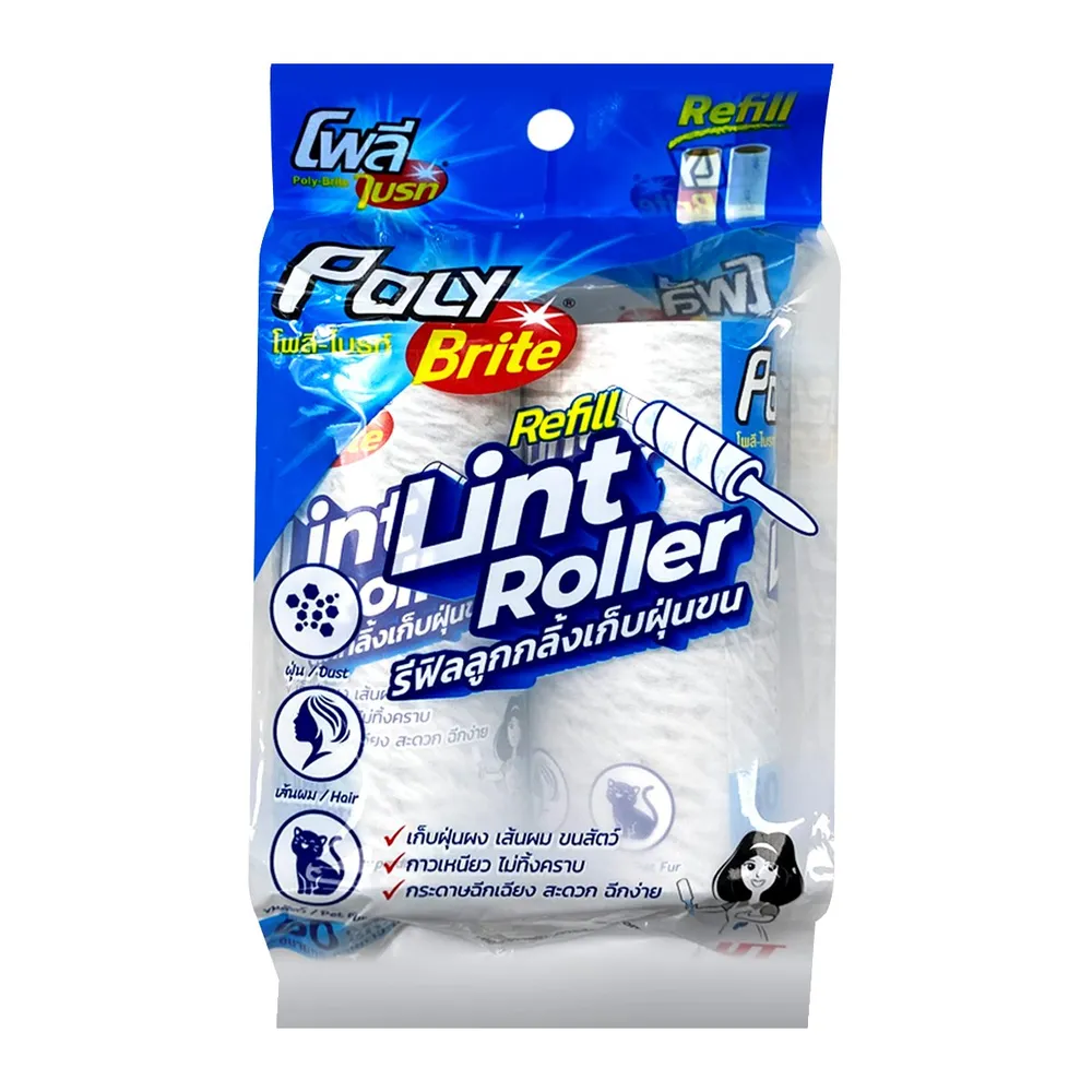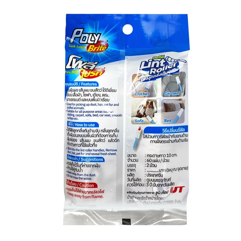 โพลี ไบรท์ ริฟิลลูกกลิ้งเก็บฝุ่นขน ใช้เก็บฝุ่นผง เส้นผม ขนสัตว์ ใช้บนเสื้อผ้า, โซฟา, เตียง, พรม, เบาะรถยนต์ และบนพื้นผิวเรียบ กาวเหนียว ไม่ทิ้งคราบ กระดาษฉีกเฉียง สะดวก ฉีกง่าย<br />