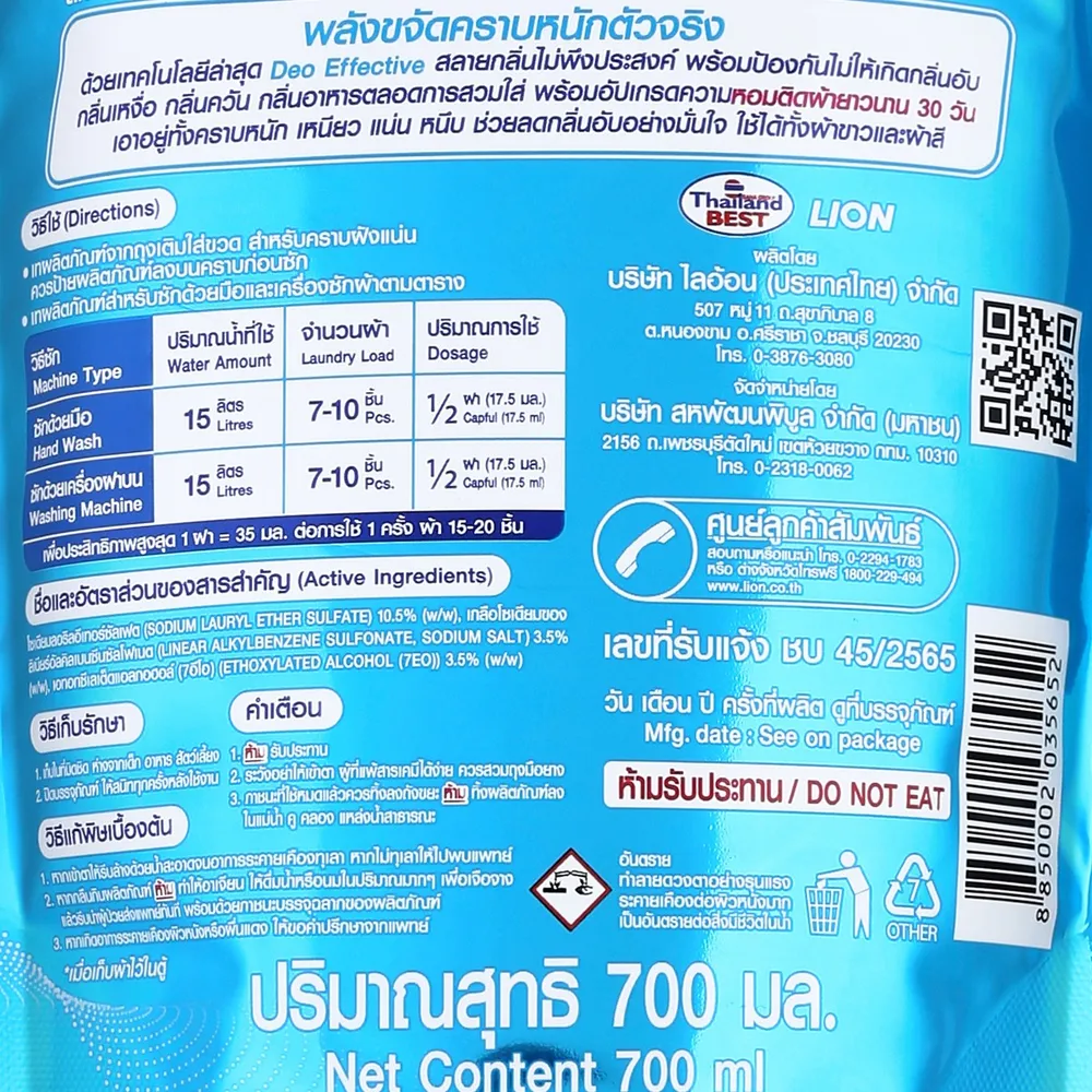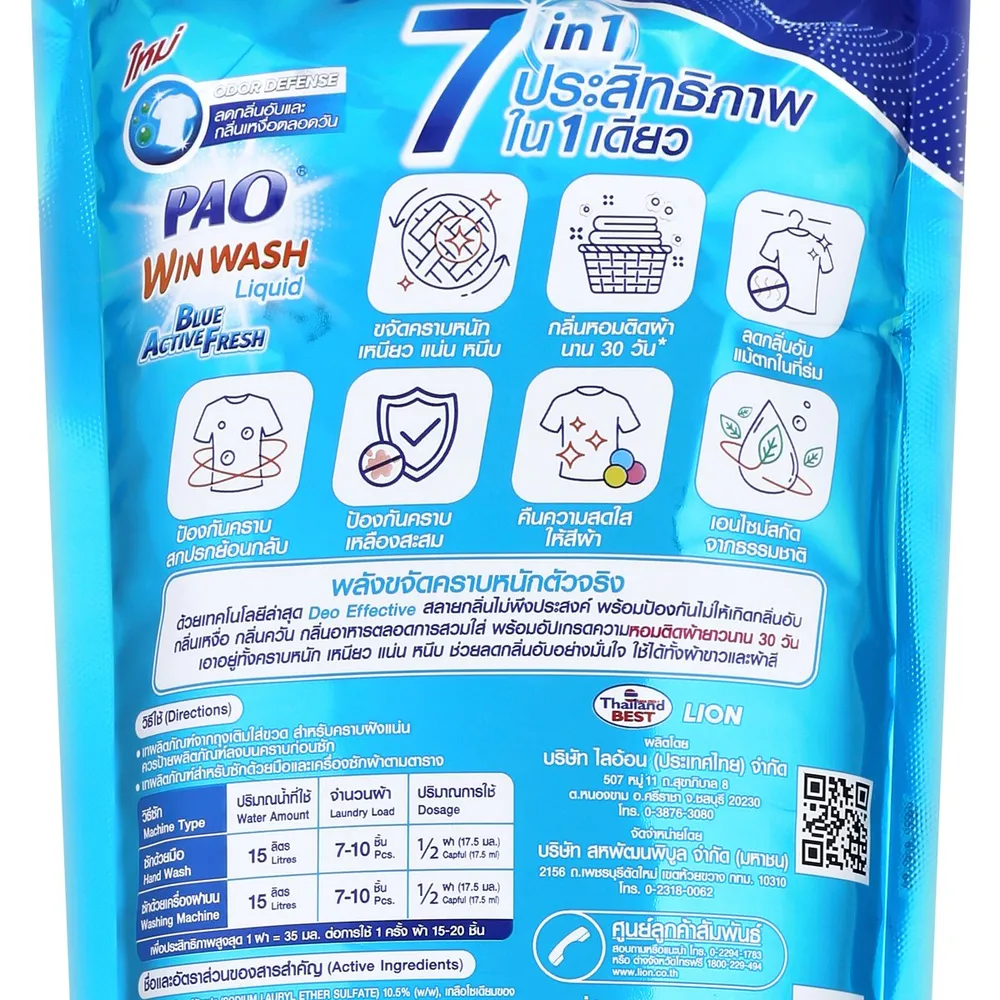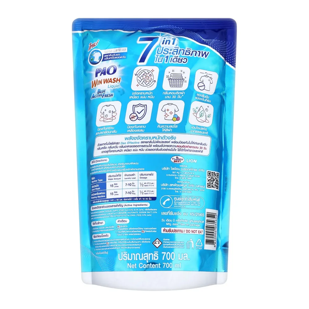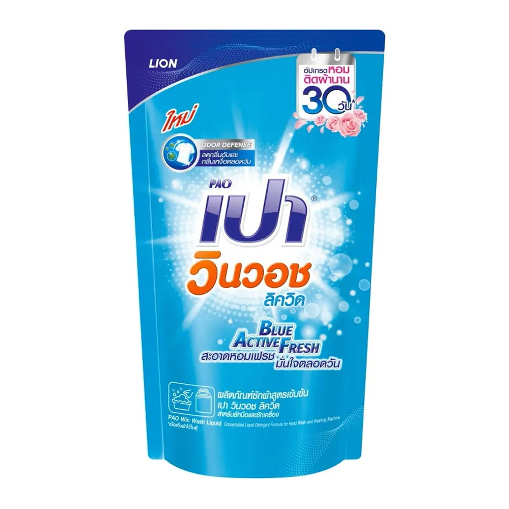 <p>เปา วิน วอช ลิควิด บลู แอคทีฟ เฟรช ผลิตภัณฑ์ซักผ้าชนิดน้ำ สูตรเข้มข้น ชนิดเติม 700 มล.<br /><br />เปา วิน วอช ลิควิด บลู แอคทีฟ เฟรช ผลิตภัณฑ์ซักผ้าชนิดน้ำ สูตรเข้มข้น ด้วยเทคโนโลยีลดกลิ่นอับชื้นและกลิ่นเหงื่อได้ตลอดวัน ขจัดคราบฝังลึกได้อย่างสะอาดล้ำลึก ถนอมเส้นใยผ้าพร้อมให้กลิ่นหอมสดชื่น และยังประหยัดมากขึ้นด้วยถุงชนิดเติม<br /><br />- สูตรเข้มข้นพิเศษ สามารถซักได้ทั้งมือและเครื่องซักผ้า<br />- ด้วยเทคโนโลยี Deoeffective สลายกลิ่นไม่พึงประสงค์ต่างๆ พร้อมกับป้องกันไม่ให้เกิดกลิ่นอับ กลิ่นเหงื่อ กลิ่นควัน กลิ่นอาหาร ตลอดการสวมใส่ <br />- เพิ่มความหอมเฟรช ให้เส้นใยผ้าหอมมั่นใจตลอดวัน<br />- Stain Fighter Booster Active ขจัดคราบฝังลึกถึงเส้นใย ป้องกันสะสมของคราบเหลือง<br />- ชนิดถุงเติม ประหยัดยิ่งขึ้น<br /><br />
