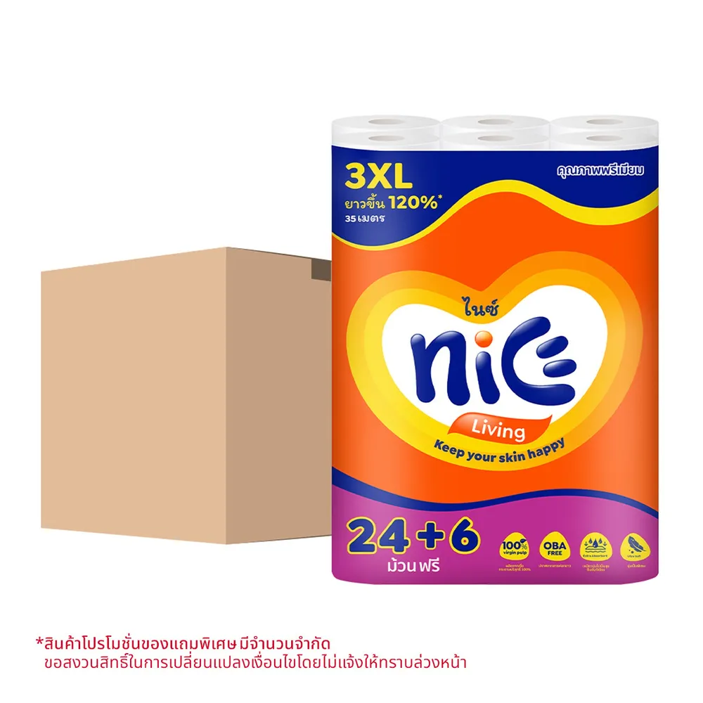 ไนซ์ เมก้าโรล กระดาษชำระ ขนาด 24+6 ม้วน ขนาดยาว 2 เท่าของรุ่นปกติ ใช้งานได้นาน แพ็คสุดคุ้ม รับกระดาษทิชชู่ฟรีทันทีในแพ็ค<br />