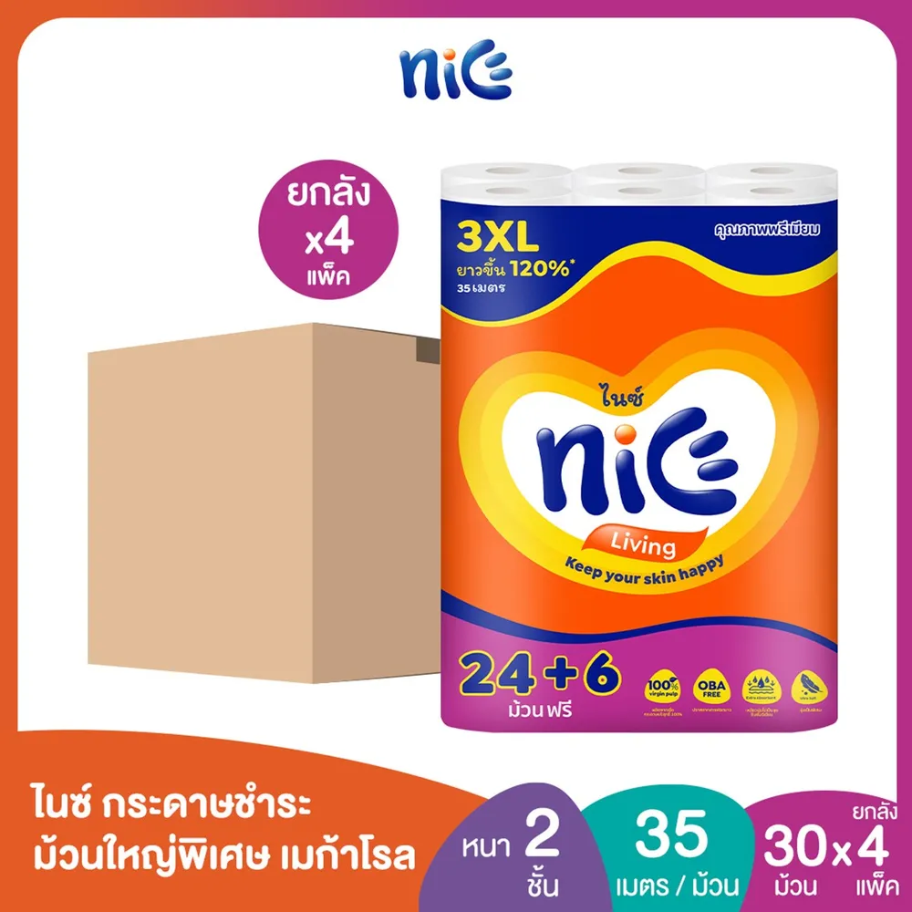 ไนซ์ เมก้าโรล กระดาษชำระ หนา 2 ชั้น 24+6 ม้วน x 4 แพ็ค