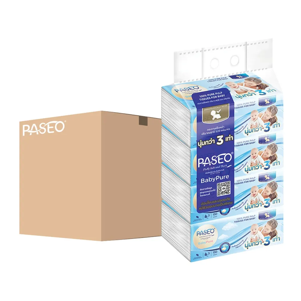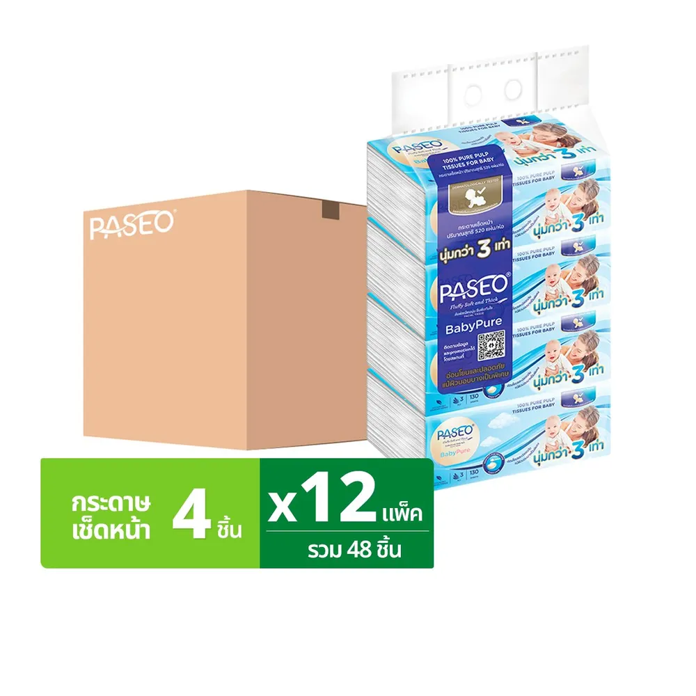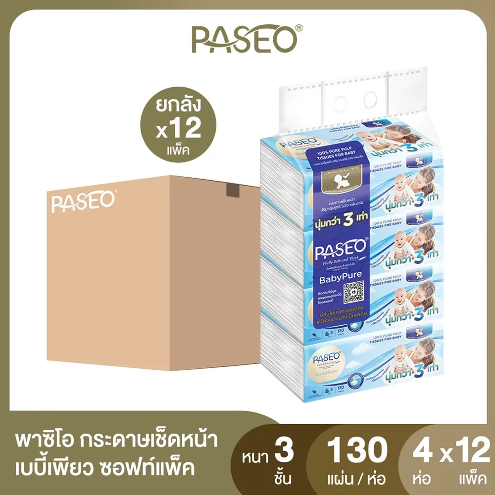 พาซิโอ เบบี้เพียวซอฟท์ กระดาษเช็ดหน้า 130 แผ่น 4 ห่อ x 12 แพ็ค