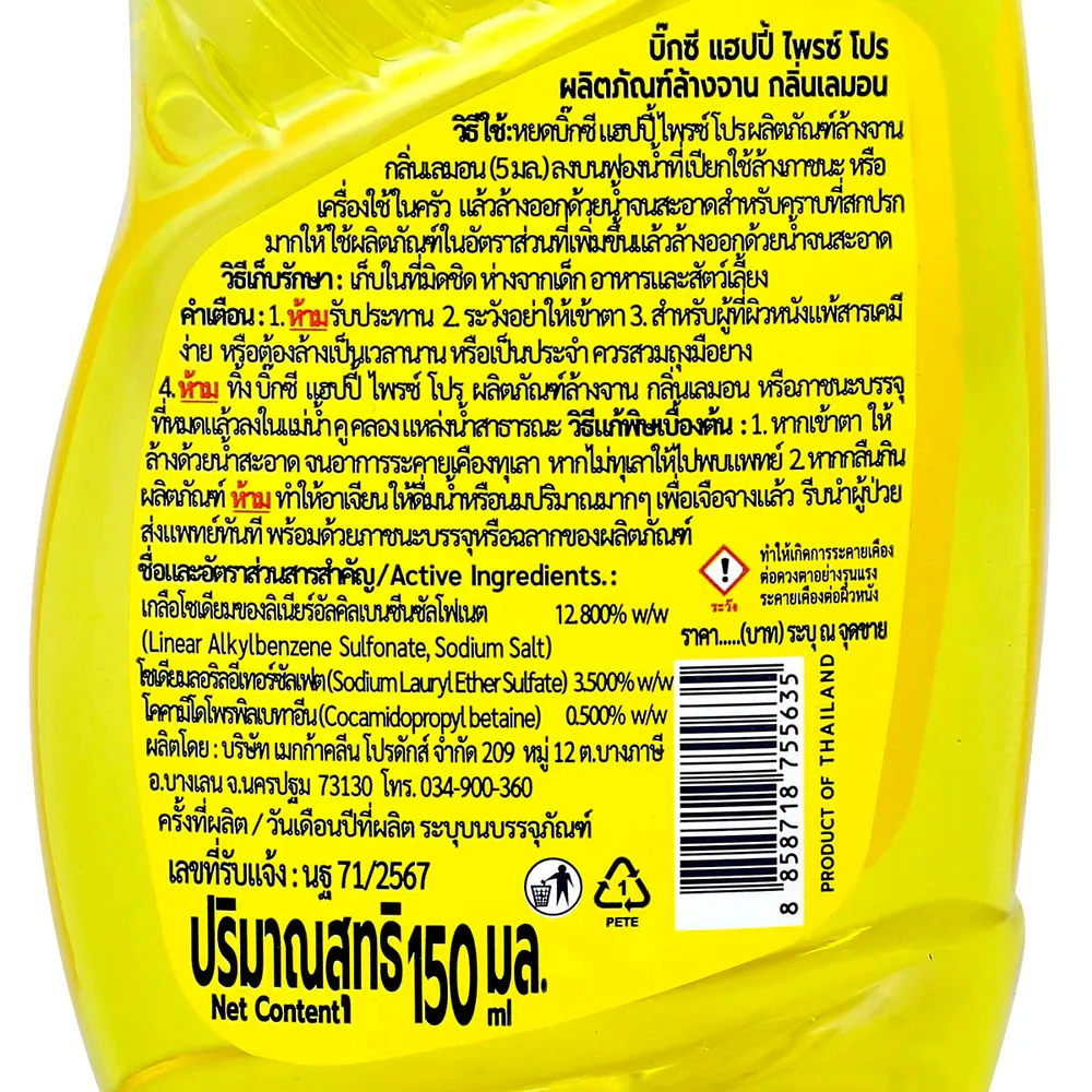 บิ๊กซี แฮปปี้ ไพรซ์ โปร น้ำยาล้างจาน กลิ่นเลมอน 150 มล. แพ็ค 6