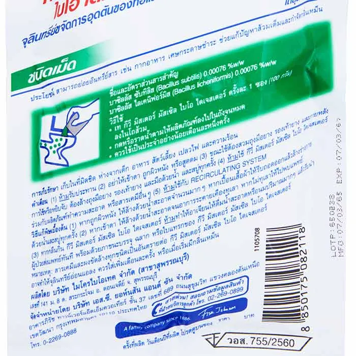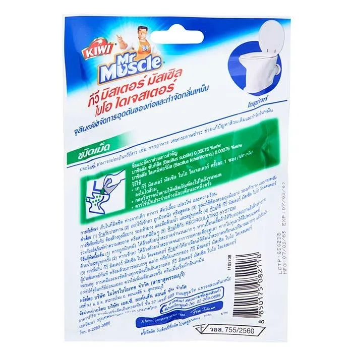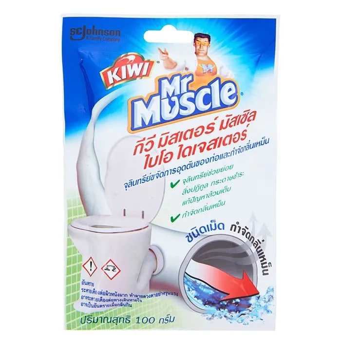 <p>กีวี มิสเตอร์ มัสเซิล ไบโอ ไดเจสเตอร์ จุลินทรีย์ขจัดกากของเสียและกลิ่นเหม็น 100 ก.<br /><br />ทำความสะอาดท่อที่อุดตันด้วย กีวี มิสเตอร์ มัสเซิล ไบโอ ไดเจสเตอร์ จุลินทรีย์ขจัดกากของเสียและกลิ่นเหม็น ที่ผ่านการทดสอบแล้วว่าสามารถย่อยอินทรีย์สารทุกชนิด เช่น กากอาหาร เศษกระดาษชำระ สามารถขจัดสิ่งอุดตันและกลิ่นไม่พึงประสงค์ให้หมดไปภายใน 48 ชั่วโมง<br /><br />- กีวี มิสเตอร์ มัสเซิล ไบโอ ไดเจสเตอร์ จุลินทรีย์ขจัดกากของเสียและกลิ่นเหม็น<br />- เม็ดทำความสะอาดท่อตัน โดยไม่กัดกร่อนสุขภัณฑ์ <br />- ประกอบด้วยจุลินทรีย์ธรรมชาติ ที่ผ่านการทดสอบแล้วว่าสามารถย่อยอินทรีย์สารทุกชนิด เช่น กากอาหาร เศษกระดาษชำระ โดยการละลายอินทรีย์สารให้กลายเป็นน้ำไหลซึมไปในดิน ส้วมที่เต็มจะค่อยๆ ลดตัวลง สามารถกำจัดกลิ่นเหม็นให้หมดไปได้อย่างมีประสิทธิภาพ<br />- ป้องกันไม่ให้ส้วมเต็มและช่วยรักษาสภาพภายในท่อระบายน้ำให้ทำงานได้ดี และสะอาดอยู่เสมอ<br />- สามารถขจัดสิ่งอุดตันและกลิ่นไม่พึงประสงค์ให้หมดไปภายใน 48 ชั่วโมง<br />- เป็นมิตรต่อสิ่งแวดล้อม ไม่เป็นพิษ และไม่เป็นอันตรายต่อสัตว์เลี้ยงหรือสิ่งมีชีวิตใดๆ<br />- วิธีใช้ เทครั้งละ 1 ซอง (100 กรัม) ลงในโถสุขภัณฑ์แล้วกดน้ำตาม<br /><br />