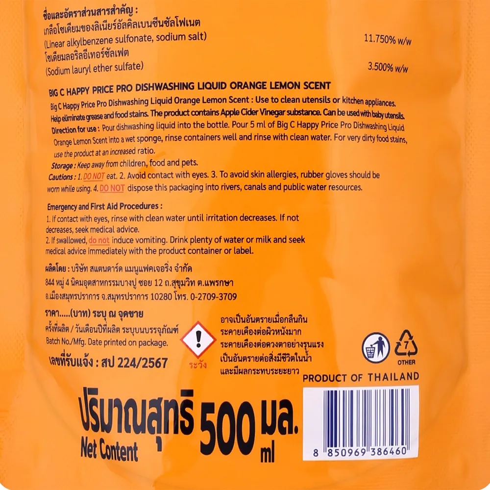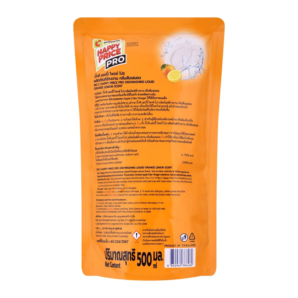 บิ๊กซี แฮปปี้ ไพรซ์ โปร น้ำยาล้างจาน กลิ่นส้มเลมอน 500 มล.