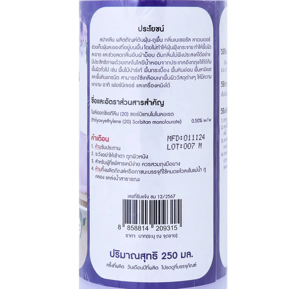 สปาคลีน น้ำยาดันฝุ่น-ถูพื้น กลิ่นเนเชอรัล ลาเวนเดอร์ 250 มล.