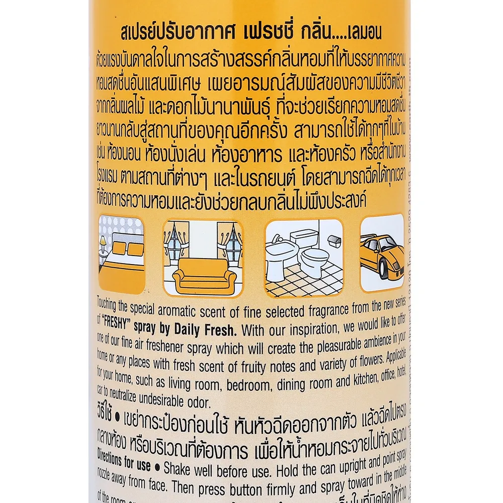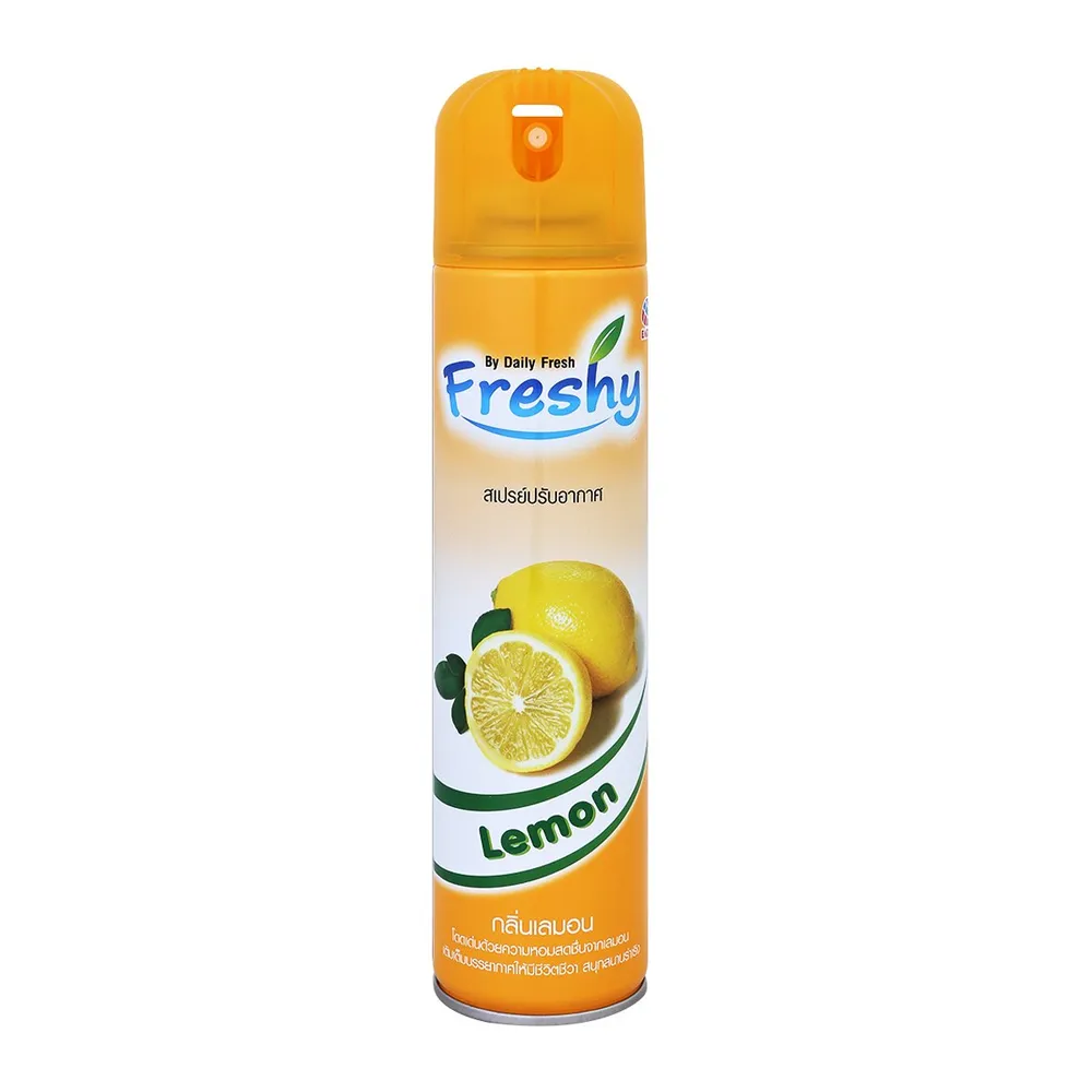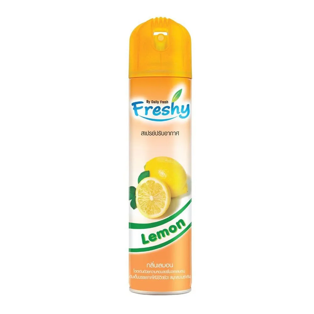 FRESHY สเปรย์ปรับอากาศ ที่สามารถดูดซับกลิ่นเหม็นและอับได้ดีเยี่ยม คุณสมบัติขจัดกลิ่นอันไม่พึงประสงค์ พร้อมให้ความหอมสดชื่นไปทุกสัดส่วน ด้วยกลิ่นเลม่อน ให้ความสดชื่น ให้ความรู้สึกผ่อนคลาย มีความสุขได้ตลอดทั้งวัน<br />