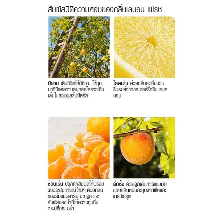 - หอมกลิ่นสดชื่นของเปลือกเลมอน ส้มเขียวหวาน และมะนาวผสมผสานกับกลิ่นสดชื่นของฟรีเซียและกุหลาบเพื่อกลิ่นหอมที่เปี่ยมด้วยชีวิตชีวา<br />