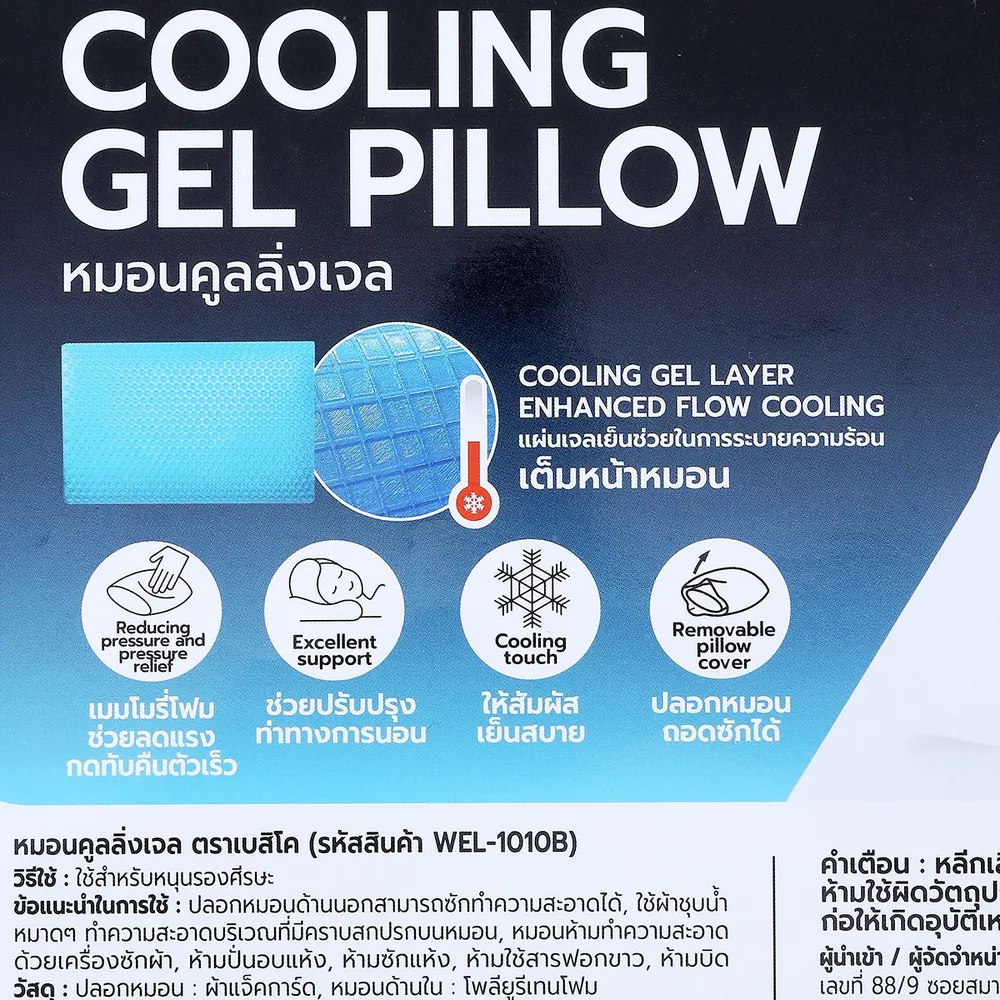 หลับไปพร้อมๆ กับความเย็นสบายด้วย เบสิโค หมอนหนุนคูลลิ่งเจล รุ่น WEL-1010B หมอนเมมโมรี่โฟมพร้อมแผ่นเจลขนาดใหญ่ 59.5x40 ซม. เจลแผ่นใหญ่ให้สัมผัสเย็นสบาย แผ่นเจลช่วยระบายความร้อน เมมโมรี่โฟมช่วยลดแรงกดทับ คืนตัวได้เร็ว ปลอกหมอนทำจากผ้าแจ็คการ์ด และยังสามารถถอดซักได้อีกด้วย<br />