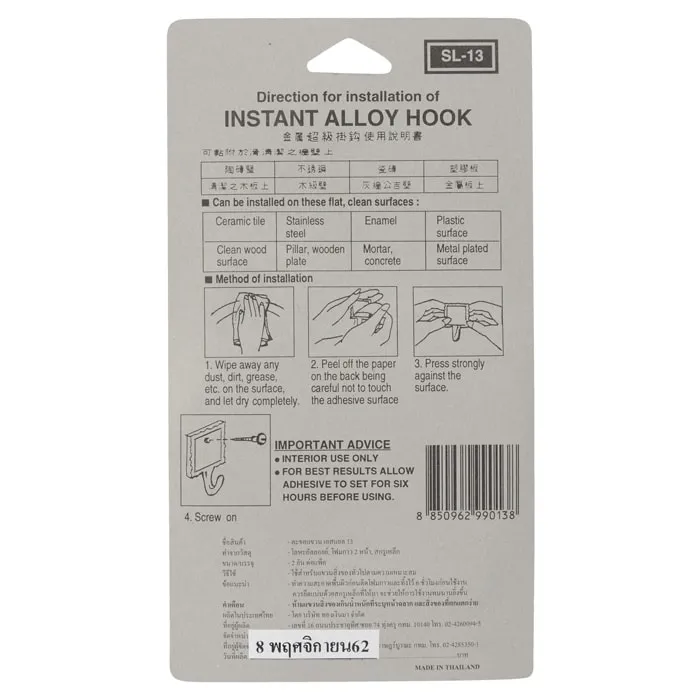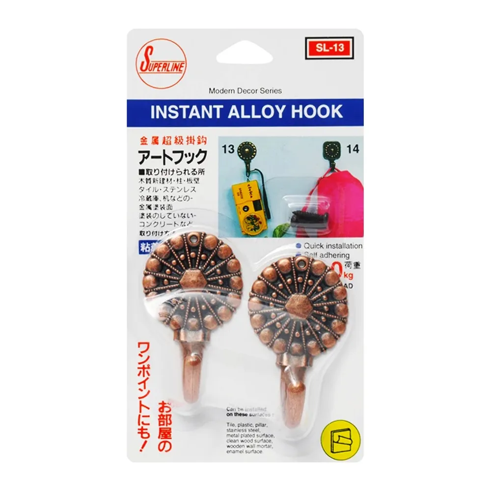 ซูเปอร์ไลน์ ตะขอแขวนของ รุ่น SL 13 จำนวน 2 ตัว ตะขอแขวนอเนกประสงค์ที่ผลิตจากโลหะอัลลอยย์ และโฟมกาว 2 หน้าคุณภาพดี มีความแข็งแรง ทนทาน น้ำหนักเบา ติดตั้งง่ายด้านหลังเป็นเทปกาวที่มีความเหนียวเป็นพิเศษ ติดแน่นทนนาน สามารถติดตั้งได้บนพื้นที่ผิวค่อนข้างเรียบ ผนังซีเมนต์ กระเบื้อง กระจก ไม้ และโลหะได้เป็นอย่างดี<br />