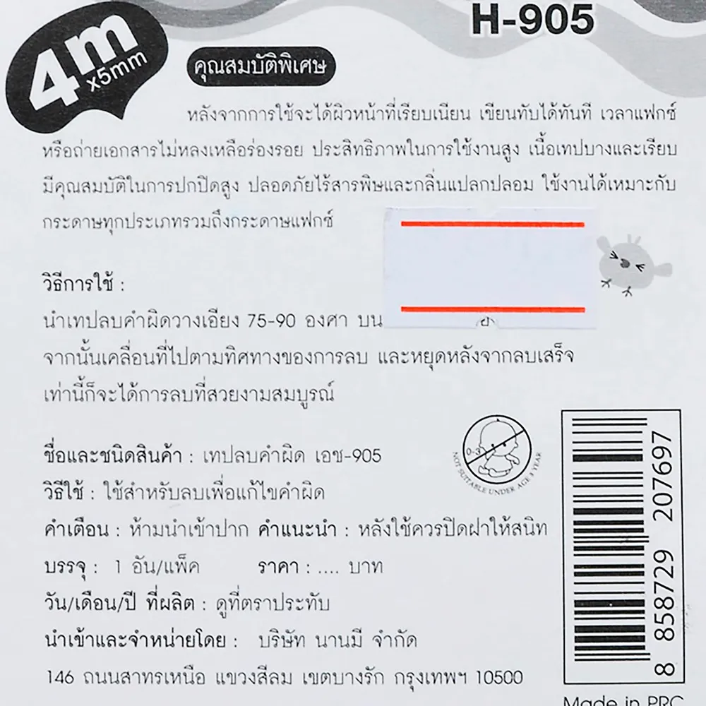 <p>ตราม้า เทปลบคำผิด รุ่น H-905<br /><br />ทำให้การจดบันทึกหรือเลกเชอร์ของคุณเป็นเรื่องง่ายและสะดวกรวดเร็ว ลบคำผิดได้เนียนกริบจนดูไม่ออก ด้วยเทปลบคำผิดจากตราม้า ที่มีประสิทธิภาพในการใช้งานสูง เนื้อเทปบางและเรียบ มีคุณสมบัติในการปกปิดสูง ปิดสนิทเอาอยู่ทุกข้อความ<br /><br />- เนื้อเทปบางและเรียบ<br />- ลบได้เรียบเนียน เขียนทับได้ทันที เวลาแฟกซ์หรือถ่ายเอกสารไม่หลงเหลือร่องรอย<br />- ความกว้าง 5 มม. ลบได้ยาว 4 เมตร<br />- ปลอดภัยไร้สารพิษและกลิ่นแปลกปลอม<br />- ใช้งานได้เหมาะกับกระดาษทุกประเภทรวมถึงกระดาษแฟกซ์<br /><br />*ภาพประกอบใช้เพื่อการโฆษณาเท่านั้น</p>