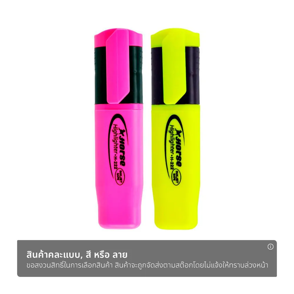 เน้นข้อความด้วยสีสันที่สดใสด้วย&nbsp;ตราม้า ปากกาเน้นข้อความ รุ่น H-222 คละสี&nbsp;ชนิดหัวตัด&nbsp;หมึกสีสดใส ติดทนนาน ไม่เป็นรอยเมื่อนำไปถ่ายเอกสารหรือส่งแฟ็กซ์&nbsp;ขีดเขียนได้ยาวถึง 450 เมตร&nbsp;สีสะท้อนสดใส ช่วยเน้นคำที่ต้องการให้เด่นชัด<br />
