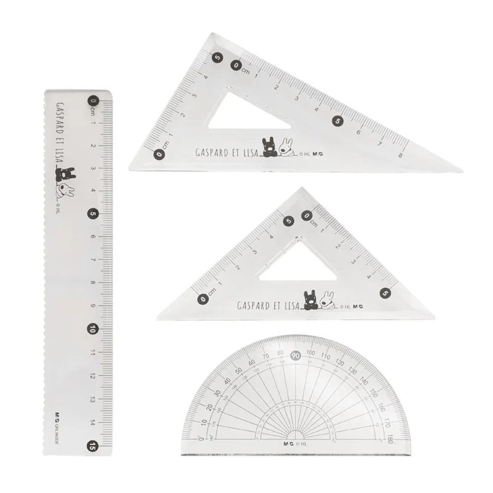 - ในชุดเลขาคณิตประกอบไปด้วย: ไม้บรรทัด 15 ซม. 1 ชิ้น / ไม้ครึ่งวงกลม 1 ชิ้น / ไม้ฉากสามเหลี่ยมมุม 45&deg; 1 ชิ้น / ไม้ฉากสามเหลี่ยมมุม 30&deg;/60&deg; 1 ชิ้น<br />