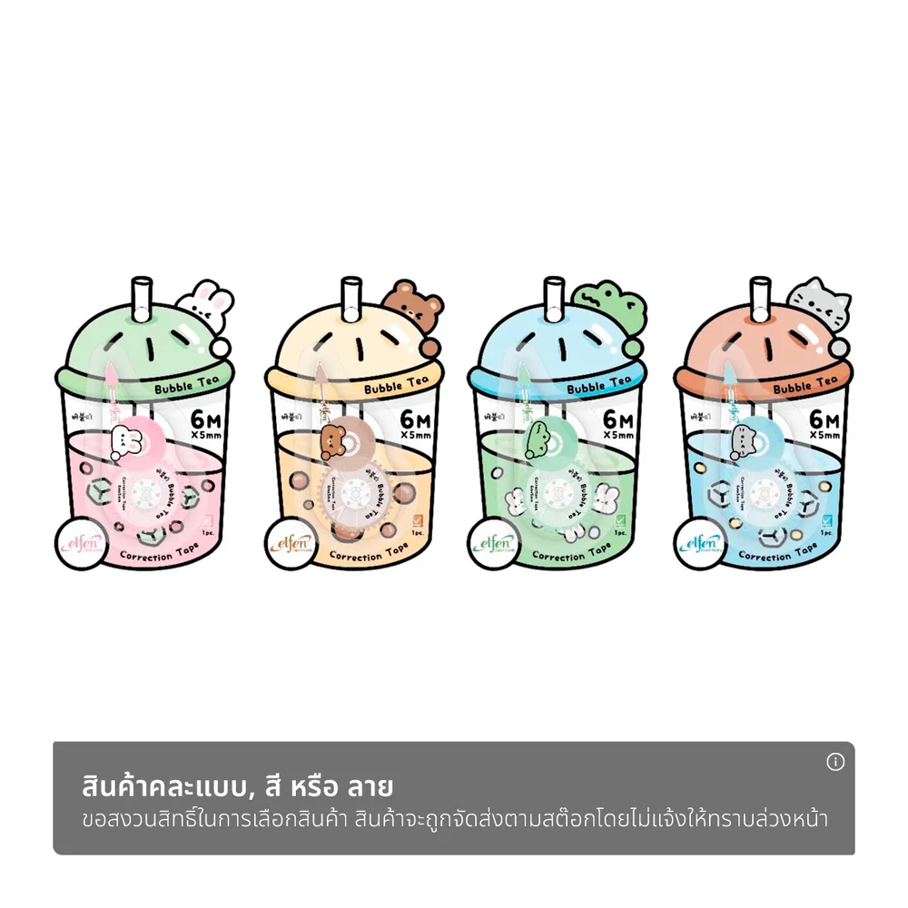 <p>เอลเฟ่น เทปลบคำผิด บับเบิลที<br /><br />มาเติมเต็มความสนุก สีสัน และจินตนาการให้กับชีวิตการเรียนและชีวิตวัยทำงานของคุณ ด้วยอุปกรณ์เครื่องเขียน และอุปกรณ์สำนักงานได้ที่บิ๊กซี<br /><br />- Elfen เทปลบคำผิด รุ่น Bubble Tea<br />- ออกแบบดีไซน์แบบกด ใช้งานถนัดมือ พกพาสะดวก<br />- ปกปิดได้เรียบเนียน เขียนทับได้ทันที<br />- กลไกคุณภาพเยี่ยม ลากลื่น ไม่ติดขัด<br />- ขนาดกว้าง 5 มม. ความยาว 6 ม.<br /><br /><span style="color: #ff0000;">*บริษัทฯ ขอสงวนสิทธิ์ในการปรับเปลี่ยนราคาจำหน่ายและโปรโมชั่น รวมถึงแพ็คเกจและปริมาณสินค้าจากผู้ผลิตได้ตามความเหมาะสม โดยไม่จำเป็นต้องแจ้งให้ทราบล่วงหน้า</span><br /><br />*ขอสงวนสิทธิ์ในการเลือกแบบสินค้า ลูกค้าจะได้รับสินค้าเพียงชิ้นเดียว และทางเราจะจัดส่งตามสต๊อกสินค้าโดยไม่ได้แจ้งให้ทราบล่วงหน้า<br /><br />*สีของสินค้าอาจมีความแตกต่าง ขึ้นอยู่กับการตั้งค่าของแต่ละหน้าจอ และภาพประกอบใช้เพื่อการโฆษณาเท่านั้น</p>