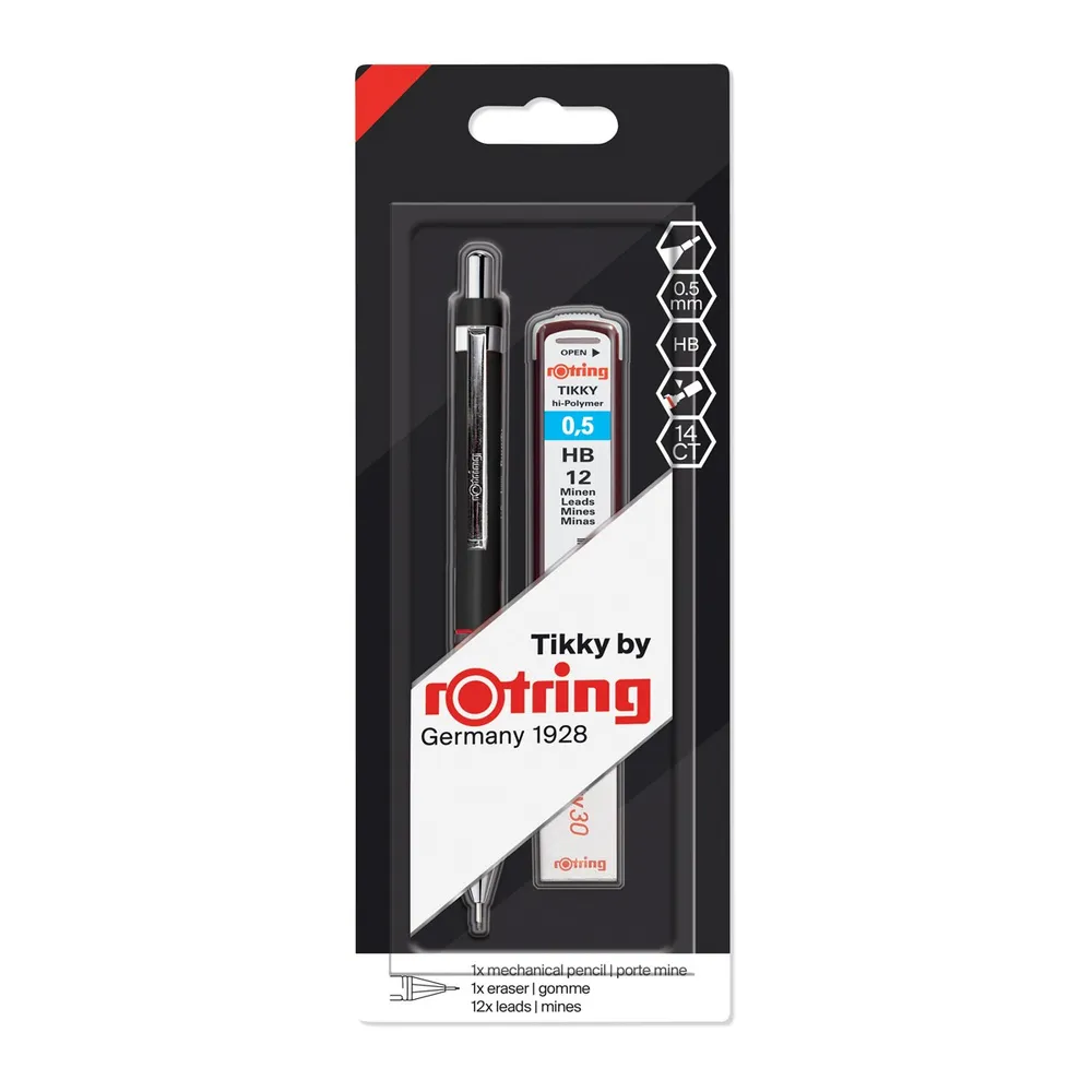 ROTRING Tikky ดินสอกดคุณภาพสูง มาตรฐานประเทศเยอรมนี ด้วยดีไซน์สุดคลาสสิก มาพร้อมกับการเรียกไส้ดินสอด้วยกลไกทองเหลืองภายในด้าม ทำให้ไส้เรียงตัวได้ดี ใช้ได้ทั้งงานเขียน หรือวาดรูป หัวดินสอแบบท่อโลหะ ช่วยผ่อนแรงกดขณะเขียน ทำให้ง่ายต่อการบังคับและจับกระชับมือขณะใช้งาน<br />