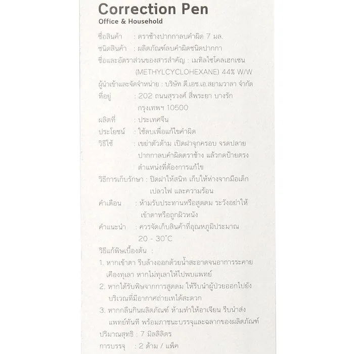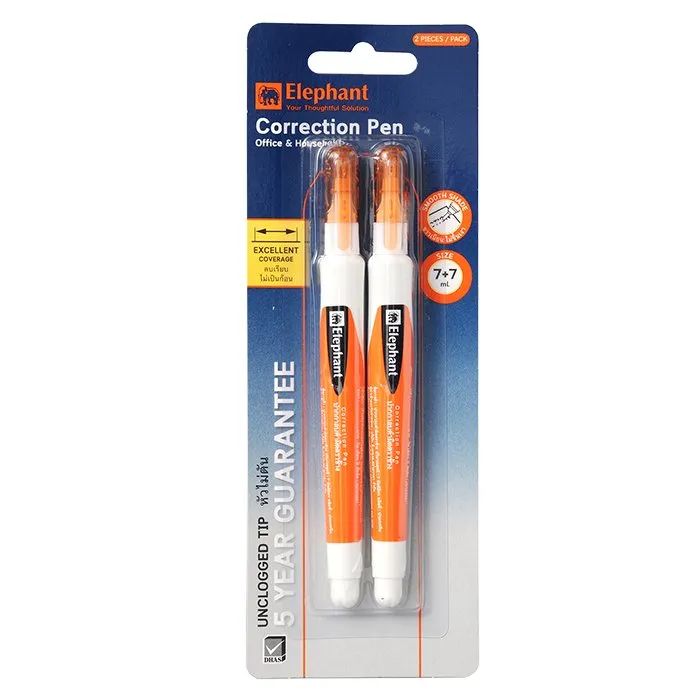 <p>ตราช้าง ปากกาลบคำผิด 7 มล. แพ็ค 2. <br /><br />เพื่อการเรียนรู้ที่ดีไม่มีสะดุดเลือกใช้ปากกาลบคำผิด จากแบรนด์เครื่องเขียนคุณภาพตราช้าง ปากกาลบคำผิดสูตรพิเศษที่ให้น้ำยาไหลลื่นควบคุมการไหลของผลิตภัณฑ์ได้ดี ลบคำผิดได้ง่าย น้ำยาแห้งเร็วไม่เลอะมือ<br /><br />- รับประกันหัวไม่ตัน 5 ปี<br />- สูตรพิเศษ ไหลลื่น แห้งเร็ว บีบง่าย<br />- ปากกาลบคำผิดชนิดหัวเข็ม ขนาด 0.68 มม.<br />- ปิดทับเรียบเนียน ดีไซน์สวยงามทันสมัย น่าใช้งาน<br />- ปริมาณน้ำยา 7 มล. บรรจุในแพ็คจำนวน 2 ชิ้น<br /><br />*ภาพประกอบใช้เพื่อการโฆษณาเท่านั้น</p>