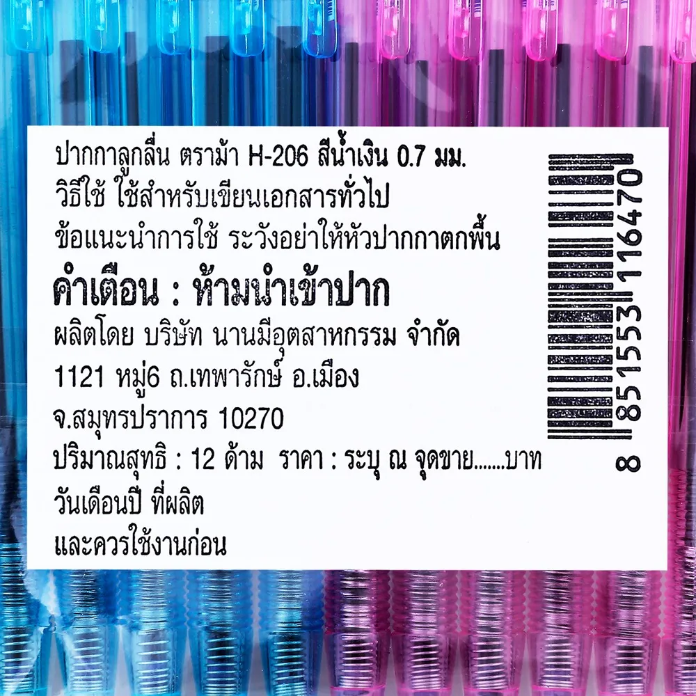 ปากกายอดฮิตของคนไทย ตราม้า ปากกาลูกลื่น H-206 สีน้ำเงินขนาด 0.7 มม. น้ำหมึกของปากกาลูกลื่น มีความหนืดน้อย (Low Viscosity) ทำให้เขียนได้ลื่นยิ่งขึ้น ไหลลื่น ต่อเนื่อง ไม่ขาดตอน เขียนหมดจด จนหยดสุดท้าย<br />