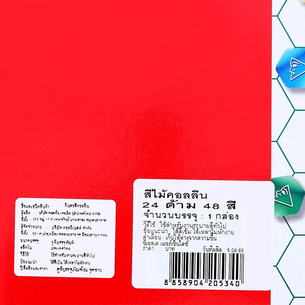 <p>คอลลีน ดินสอสี 24 แท่ง 48 สี<br /><br />คอลลีน ดินสอสี ที่ผลิตจากวัสดุคุณภาพดี ผ่านกระบวนการการผลิตที่ได้มาตรฐาน มาพร้อมฟังก์ชันการใช้งานที่ตอบโจทย์ของผู้ใช้งานได้อย่างลงตัว<br /><br />- ผลิตจากวัสดุที่มีคุณภาพ<br />- ใช้งานได้ในหลากหลายโอกาส<br /><br /><span style="color: #ff0000;">สินค้าที่ได้รับอาจมีการปรับเปลี่ยนแพ็คเกจและปริมาณจากผู้ผลิต ขออนุญาตสงวนสิทธิ์ในการเปลี่ยนแปลงดังกล่าว โดยไม่แจ้งให้ทราบล่วงหน้า<br /><br /></span>*ภาพประกอบใช้เพื่อการโฆษณาเท่านั้น</p>