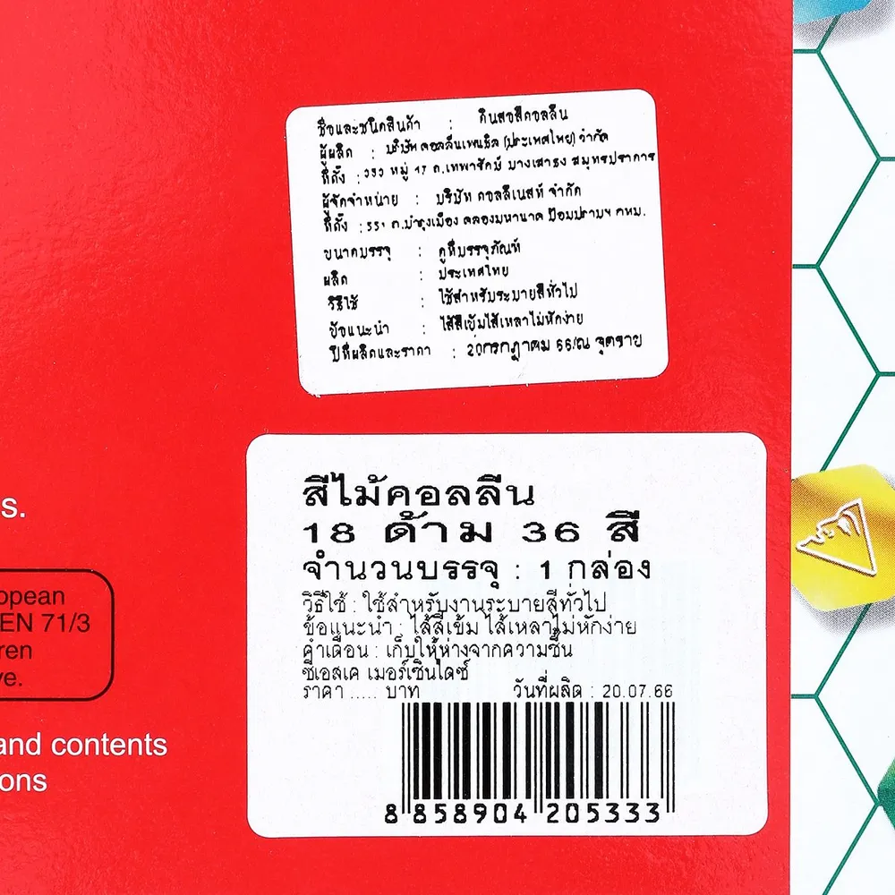 <p>คอลลีน ดินสอสีไม้<br /><br />ดินสอสีไม้คุณภาพสูง ที่พร้อมช่วยให้คุณได้ปลดปล่อยอารมณ์และเสริมสร้างจินตนาการผ่านผืนกระดาษ<br /><br />- ดินสอสีไม้ 2 หัว<br />- ดินสอสีไม้แท่งรูปทรงเหลี่ยมถือจับถนัดมือ<br />- ปลอดภัย​ ไร้สารพิษ​ ได้มาตรฐานยุโรป​ Ce​safety​ Standard​ EN​ 71/3<br />- สีสันเข้ม คม ชัด ไส้นุ่ม ไม่เปราะ​ ผ่านกรรมวิธีการผลิตที่ทันสมัยจากประเทศญี่ปุ่น<br />- สามารถเหลาได้<br />- มีทั้งหมด 36 เฉดสี คุ้มค่าเหมาะสมกับราคา<br /><br />*สีของสินค้าอาจมีความแตกต่าง ขึ้นอยู่กับการตั้งค่าของแต่ละหน้าจอ และภาพประกอบใช้เพื่อการโฆษณาเท่านั้น</p>