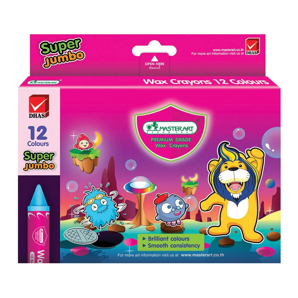 แต่งเติมทุกจินตนาการ พร้อมสร้างสรรค์ทุกผลงานศิลปะ ด้วยมาสเตอร์อาร์ต สีเทียน ขนาดซุปเปอร์จัมโบ้ 12 สี สีเทียนคุณภาพดีที่ให้เนื้อสีเนียน ระบายนุ่มมือ สีสดคมชัด สามารถเขียนระบายทับกันได้ หรือทำเทคนิคขูดสี<br />